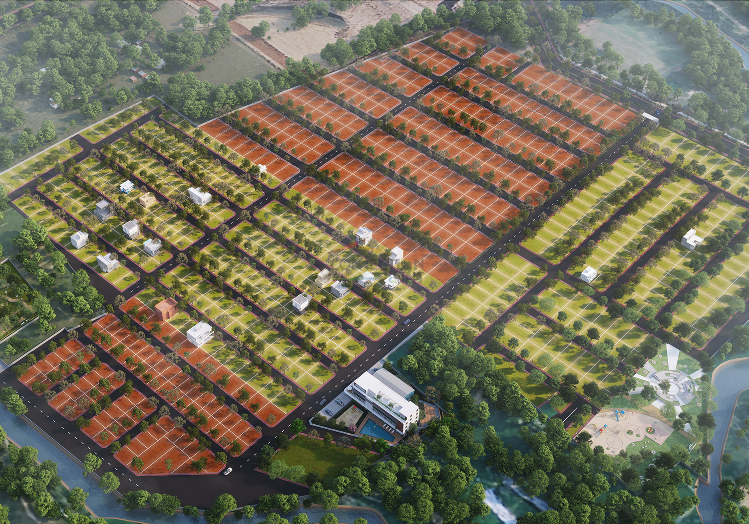 Street Lighting & Paved Roads – Internal blacktop roads with elegant lighting and pedestrian-friendly walkways.